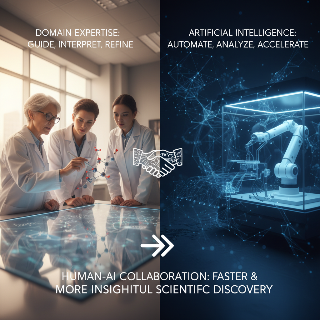 Human-AI Collaboration: Integrating domain expertise with artificial intelligence to guide, interpret, and refine autonomous experiments for faster and more insightful scientific discovery.